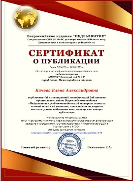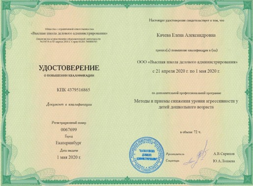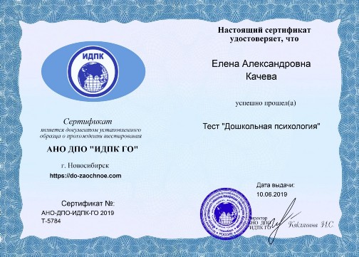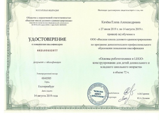 • Удостоверение о повышении увалификации "Основы робототехники и LEGO-конструирования для детей дошкольного и младшего школьного возраста"