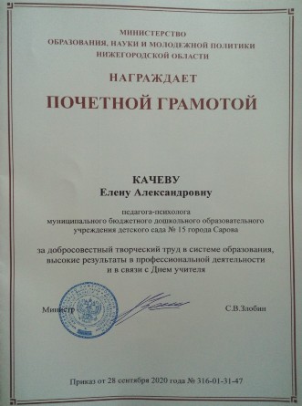 • Почётная грамота Министерства образования, науки и молодежной политики Нижегородской области